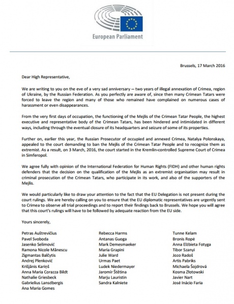 Низка євродепутатів звернулися до високого представника ЄС з зовнішньої і безпекової політики Федеріки Могеріні з проханням направити до Криму спецмісію ЄС для спостереження за судовим процесом щодо заборони Меджлісу кримськотатарського народу.