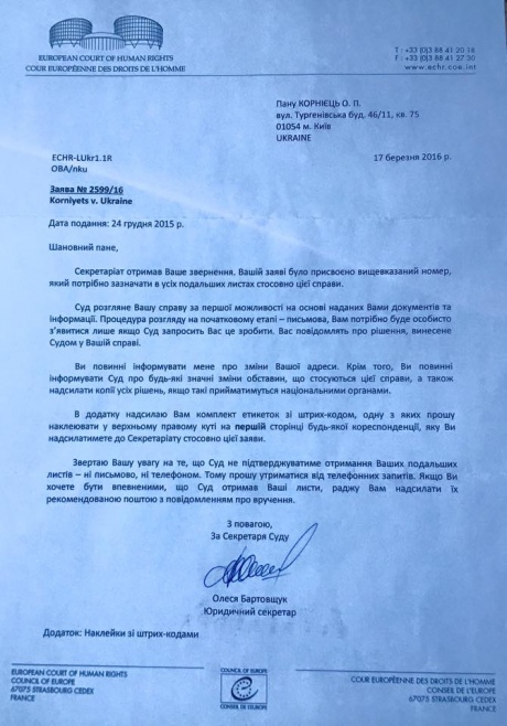 В якості доказу колишній заступник прокурора Київської області наводить скан-копію листа, отриманого з секретаріату ЄСПЛ.