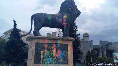 Тисячі протестувальників в яскравому одязі закидали кульками з фарбою будівлю МЗС Македонії в Скоп'є 25 квітня.