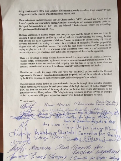 Депутати наголосили, що використання терміну "громадянська війна" у продуктах ВВС є тенденційним і таким, що вводить в оману громадськість і закликали канал до офіційного пояснення щодо цієї ситуації.