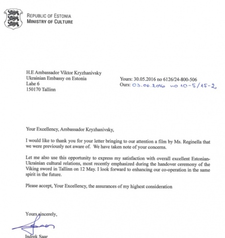 У листі міністра культури Естонії Індрека Саара послу України Віктору Крижанівському не йшлося про відмову перешкодити показу на території Естонії пропагандистського фільму про Донбас.