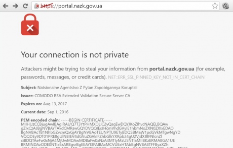 Також знайдено один зі шляхів, який дозволяє уникнути конфлікту сертифікатів та перейти до форми подання декларацій у браузері Chrome. Для цього необхідно набрати в адресному рядку chrome://net-internals/#hsts та видалити домен portal.nazk.gov.ua.