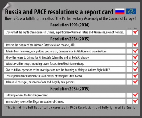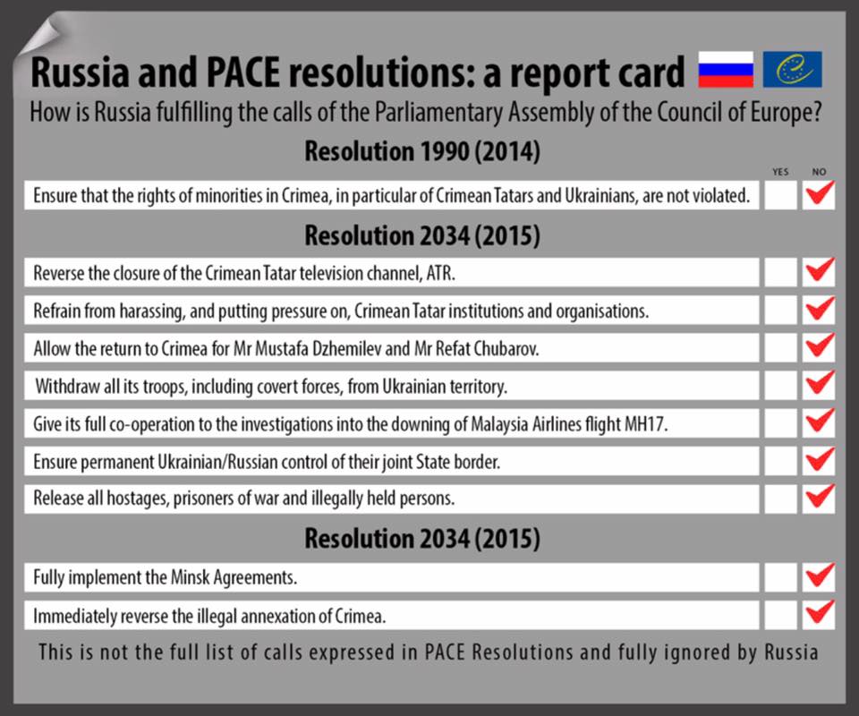 | Короткий перелік вимог резолюції ПАРЄ, які не виконала РФ (натисніть для збільшення) |