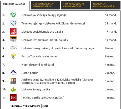 Ліберальний рух тепер матиме 14 депутатів у Сеймі, в по вісім мандатів дісталося Виборчій акції поляків Литви і партії "Порядок і справедливість". Ще два мандати отримала Партія праці (лейбористи), по одному - Литовська партія зелених, Партія центру і партія "Литовський список".