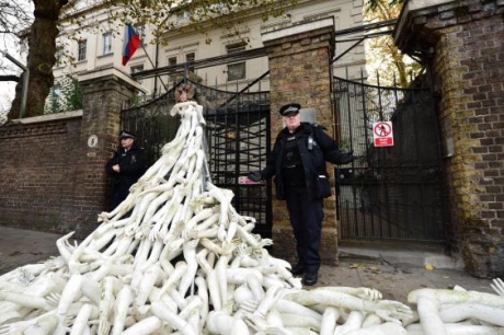 У Лондоні активісти закидали вхід до посольства Росії сотнями пластикових кінцівок з манекенів на знак протесту проти бомбардувань в Сирії.