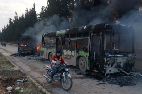 Кілька автобусів, що направлялися для перевезення людей з двох сіл у провінції Ідліб за угодою про обмін на вивезення людей зі східного Алеппо, зазнали нападу невідомих у біли спалені вщент.