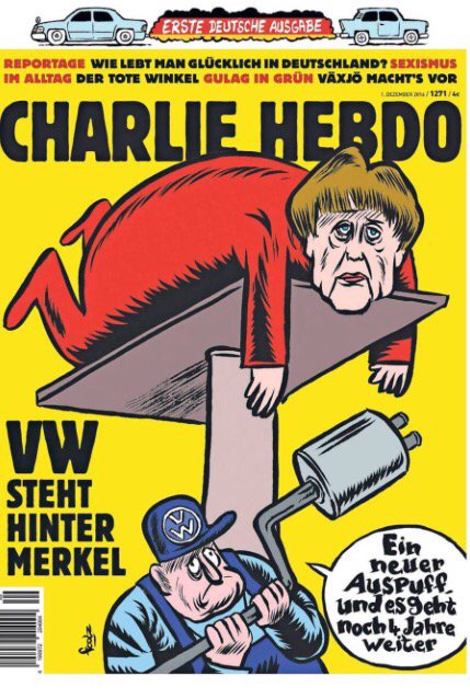Французький сатиричний журнал Charlie Hebdo запустив версію німецькою мовою і на обкладинці першого номера висміяв канцлера Німеччини Ангелу Меркель.