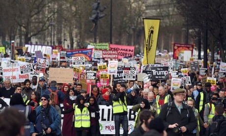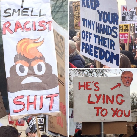 Повідомляється, що протестувальники розмахували плакатами, заявляючи - "Мусульмани не будуть "цапами-відбувайлами", "Ні - війні, ні - Трампу", та скандували "Тереза Мей, ганьба тобі".