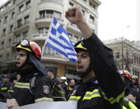 Сотні пожежників вийшли на вулиці Афін в середу, 8 лютого, на знак протесту щодо обмежень найму в державному секторі, що впроваджуються згідно з міжнародними умовами порятунку Греції.