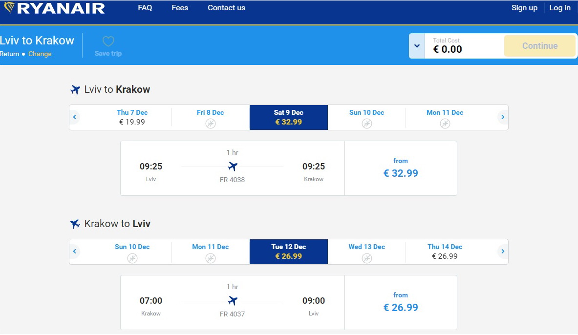 Квитки на вихідні дні коштують дорожче. Наприклад, зі Львова до Кракова можна долетіти за 32,99 євро.