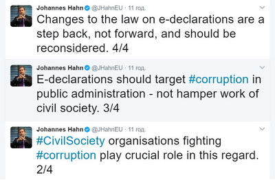 Європейський комісар з питань політики сусідства Йоганес Ган заявив про неприпустимість норми, за якою антикорупційні активісти та їх контрагенти мають подавати е-декларації.