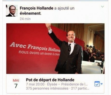 У другій половині дня в четвер на президентському аккаунті з’явився пост і запрошенням на "вечірку з нагоди відставки Олланда", яка начебто відбудеться 7 травня в Єлисейському палаці.