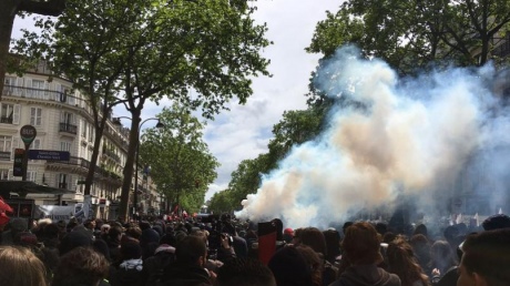 Першотравневі мітинги у Парижі, які проходять в той же день, що й агіткампанії кандидатів у президенти Франції Марін Ле Пен та Еммануеля Макрона, супроводжуються сутичками між демонстрантами та поліцією.