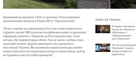 Як відомо, напередодні Голос Америки поширив коментар Держдепу про те, що блокування російских сайтів є проблемою для свободи слова. Таким чином США долучилися до Ради Європи та низки неурядових організацій, які критикують Київ за це рішення.