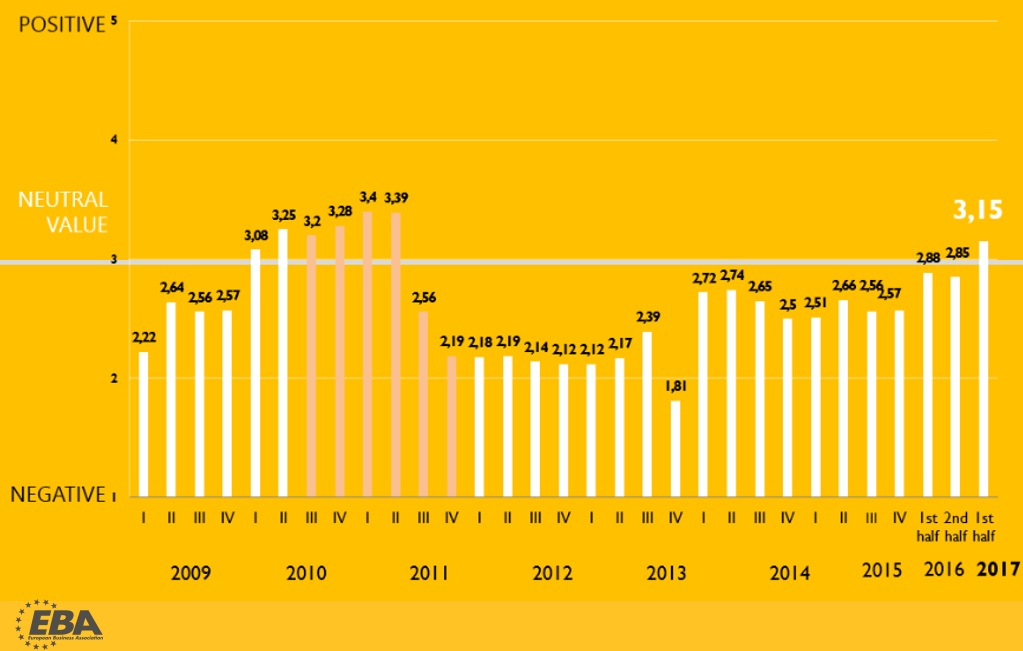 Європейська Бізнес Асоціація провела опитування серед керівників 142 найбільших міжнародних та українських компаній. Результати опитування показали, що негативні настрої бізнесменів не зникли, але послабилися.