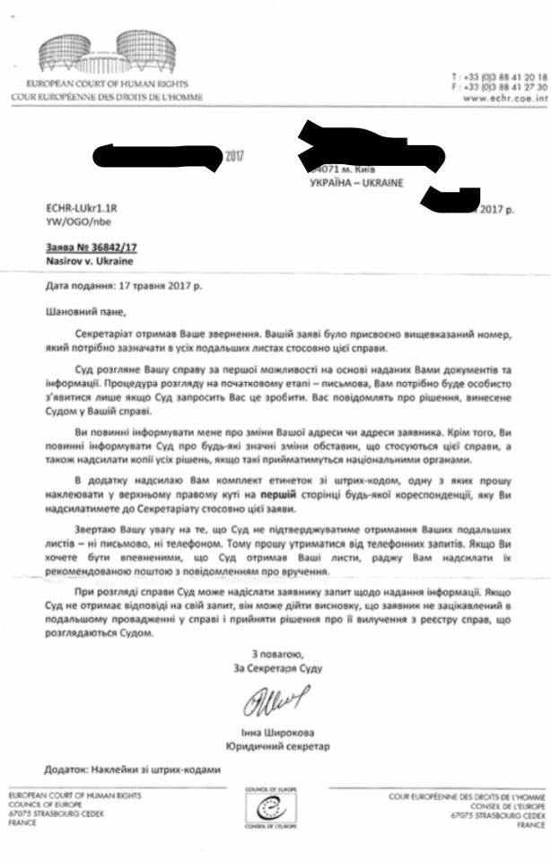 Насіров також виклав фотокопію відповіді ЄСПЛ, де, зокрема, зазначено, що секретаріат суду "отримав його звернення" і суд розгляне справу "за першої можливості".