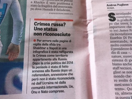 Нагадаємо, La Gazzetta dello Sport надрукувала прев'ю матчу Ліги чемпіонів "Шахтар" - "Наполі", проілюструвавши його картою, де Крим вказано територією РФ.