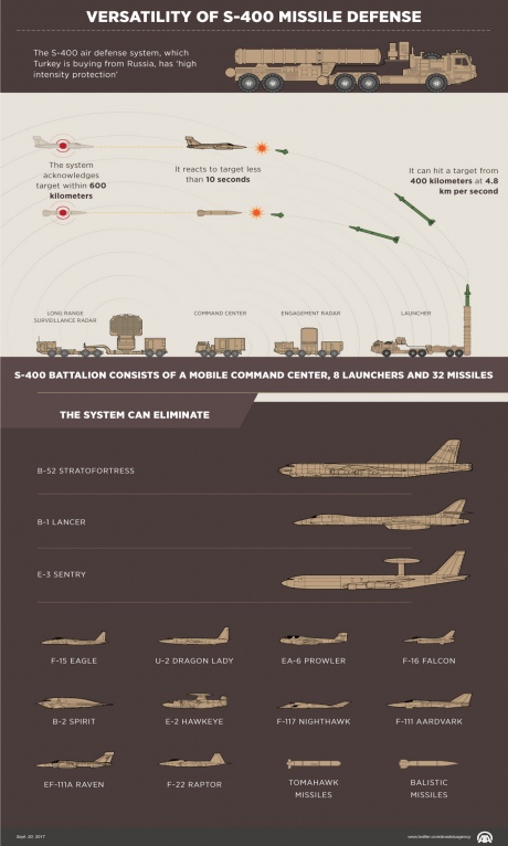Державна інформаційна агенція Туреччини Anadolu опублікувала інфографіку, що демонструє можливості нового російського зенітно-ракетного комплексу С-400, який Анкара купує у Москви.