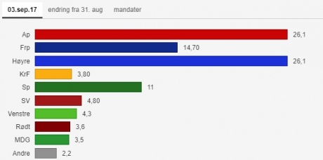 Третьою йде партія "Прогрес" (Frp), яку підтримують 14,7% виборців. Ця політична сила підтримує консерваторів. Далі з підтримкою в 11% йде партія "Центр" (Sp), що підтримує лейбористів.
