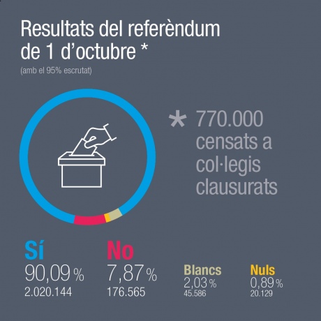 Каталонський уряд заявив, що порахував 2 262 424 бюлетенів. За результатами обробки 95%, на підтримку незалежності проголосували 2 020 144 каталонців (90,09%), проти – 176 566 осіб (7,87%), порожніми були 45 586 бюлетенів (2,03%) і визнані недійсними 20 129 (0,89%).