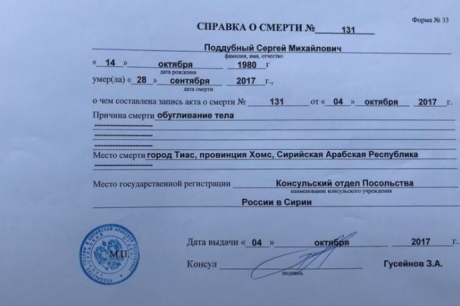 Документ, що має назву "довідка про смерть" і виданий 4 жовтня, реєструє загибель 36-річного жителя Краснодарського краю Сергія Піддубного, що сталася 28 вересня, в місті Тіас провінції Хомс. Смерть, як зазначено в довідці, настала від "обвуглювання тіла".