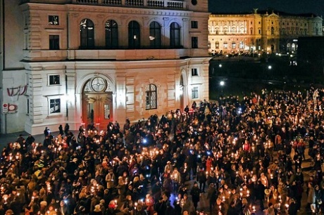 Зі свічками, електричними лампами та факелами вони утворили вогняний ланцюг навколо урядового кварталу.