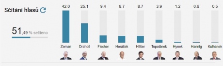 Після підрахунку понад половини голосів виборців Мілош Земан перемагає із результатом у 42%, інформує чеське видання Aktualne.