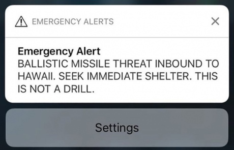 Зранку у суботу мешканці Гаваїв отримали на телефони повідомлення з сигналом тривоги наступного змісту: "Загроза з боку балістичної ракети, що прямує до Гаваїв. Негайно шукайте укриття. Це не навчання".