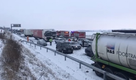 Шосе D1, ключовий маршрут, який з'єднує столицю Прага зі сходом країни, заблоковане в кількох місцях після численних аварій. Принаймні, двоє людей отримали травми у ДТП.