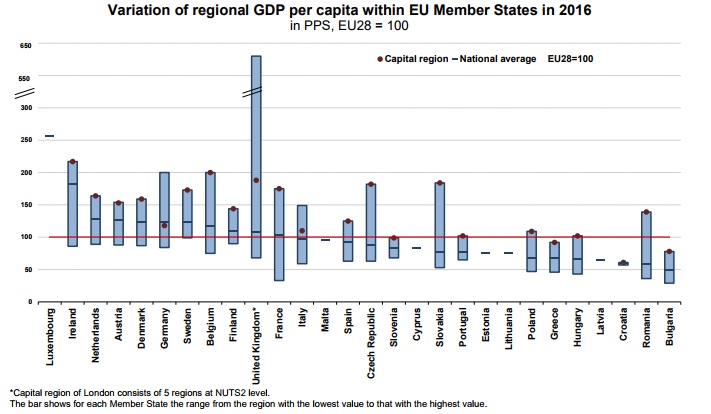 Провідні місця в рейтингу регіонального ВВП на душу населення також посідають Велике Герцогство Люксембург (257%), регіон Південь-Схід в Ірландії (217%), Брюссель у Бельгії та Гамбург у Німеччині (обидва 200%).