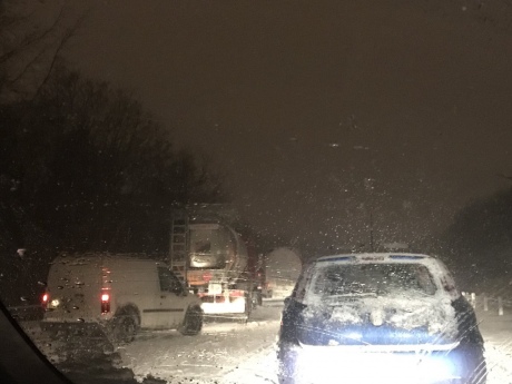 Сотні людей провели минулу ніч у заторах на автодорогах, рух на яких був заблокований аваріями через снігові замети. Деякі очевидці повідомляли у соцмережах, що провели у заторах до 16 годин.