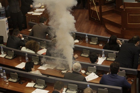 Сльозогінний газ був розпилений депутатами лівої політичної партії "Самовизначення" (Vetevendosje) тоді, коли спікер парламенту Кадрі Веселі закликав депутатів до голосування за ратифікацію угоди.