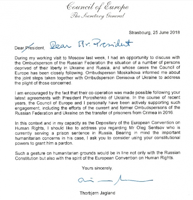 Генеральний секретар Ради Європи Турбйорн Яґланд подав офіційне прохання до президента Росії Владіміра Путіна помилувати українського режисера Олега Сенцова, який утримується у російській в'язниці і голодує вже 43 дні.