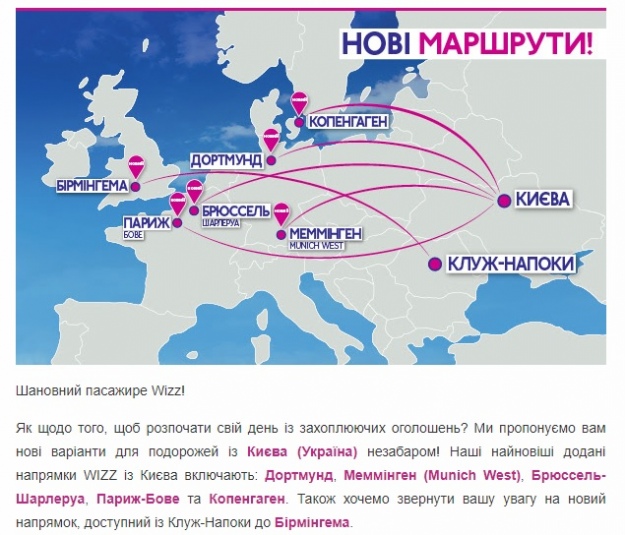 Авіакомпанія анонсувала додаткові рейси в Дортмунд, Меммінген (Munich West) і Копенгаген, куди вже виконує рейси, а також до французького аеропорту Бове (70 км від французької столиці) і аеропорту Шарлеруа (46 км від бельгійської столиці).