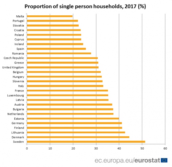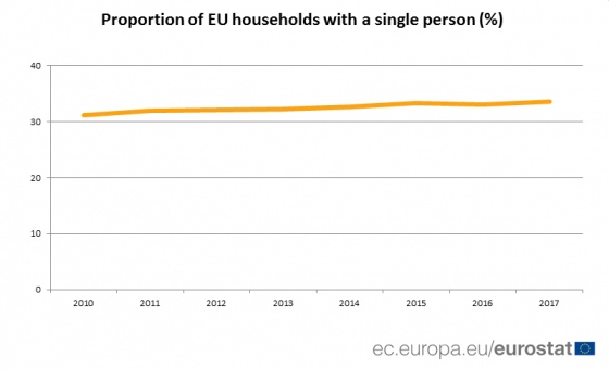 Останні статистичні дані показують, що 2017 року у 34% домогосподарств ЄС мешкали самотні дорослі без дітей. Ця цифра зросла на 3 відсотки з 2010 року.