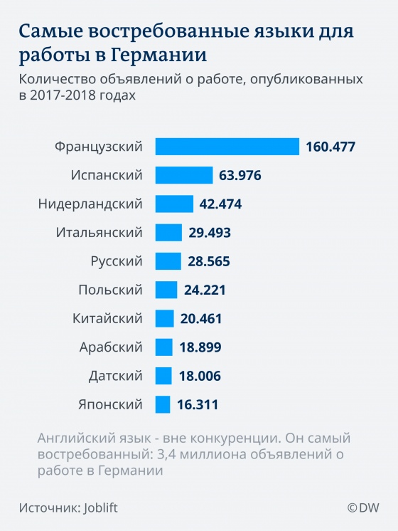 Російська мова в рейтингу найбільш затребуваних іноземних мов на німецькому ринку праці займає п'яте місце (понад 28,5 тиc. оголошень про вакансії були опубліковані в 2017-2018 роках).