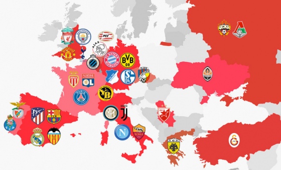 На мапі зображені клуби-учасники Ліги чемпіонів з футболу та країни, які вони представляють.