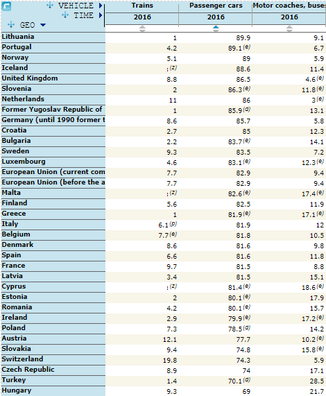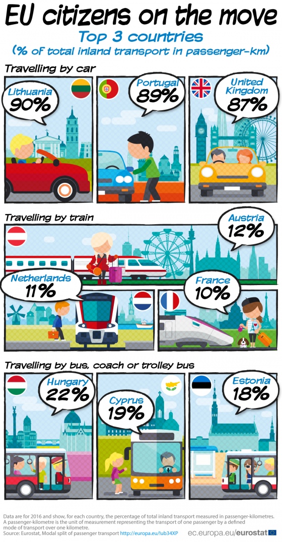 2016 року поїздки автівками склали 83% пасажиро-кілометрів у ЄС, у порівнянні з 9% пересування міськими і міжміськими автобусами та тролейбусами, а також 8% - потягами.