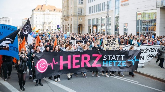 Одночасно близько десяти тисяч людей вийшли на вулиці Дрездена, виступаючи проти ксенофобії та насильства. Акція відбувається під гаслом "Серце замість цькувань". Протестувальники тримали в руках плакати з надписами "Разом проти правого руху у Європі".