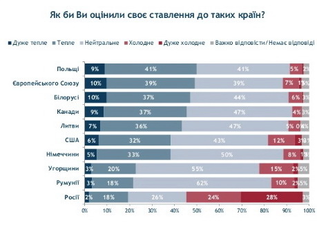 Найтепліше ставлення опитані громадяни України відчувають до Польщі (50%), Європейського Союзу в цілому (49%) та Білорусі (47%). Відсоток опитаних українців, які ставляться до цих країн (та об’єднання) "холодно" або "дуже холодно" відносно невеликий: Польща (5%), ЄС (8%), Білорусь (6%).