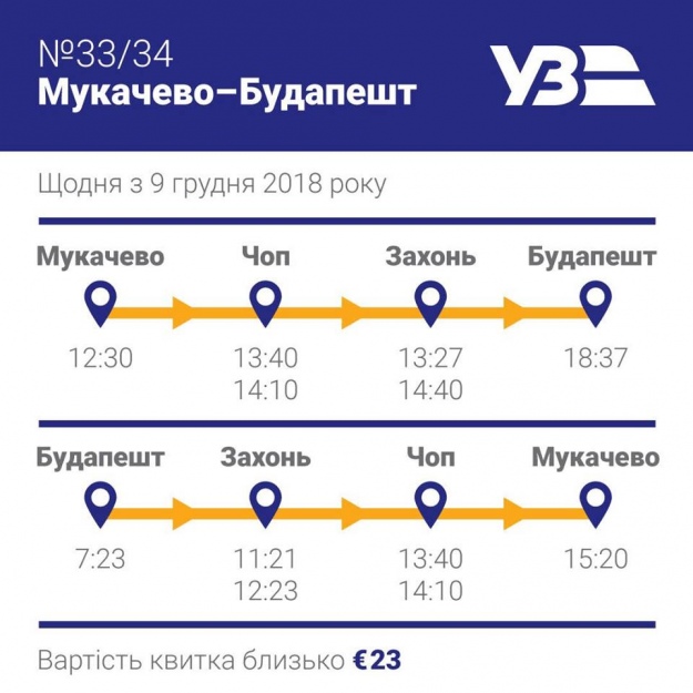 Потяг "Мукачево-Будапешт" - щоденний прямий безпересадковий маршрут. У дорозі він перебуватиме близько 6 годин. Кравцов також оприлюднив графік курсування потяга та вартість квитка. Вона становитиме близько 23 євро.