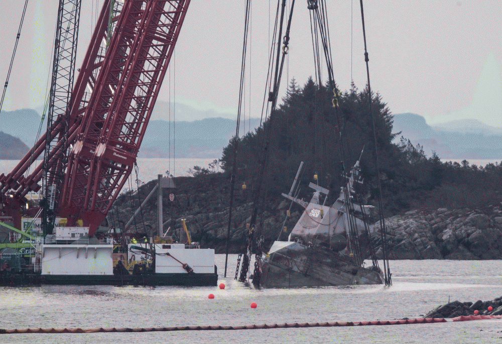 У Норвегії почали піднімати фрегат, який затонув у листопаді після зіткнення з танкером