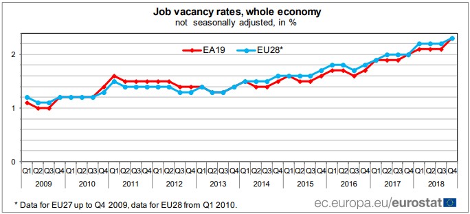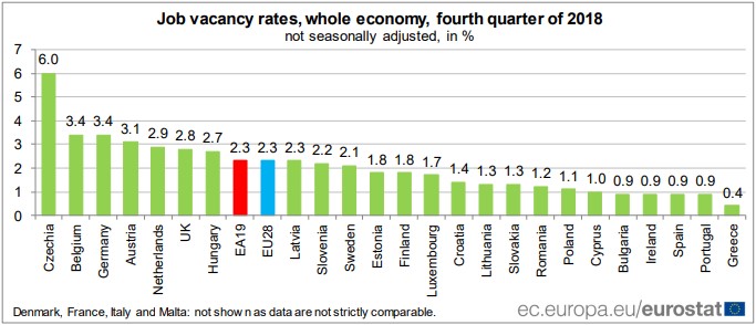 Якщо у середньому в Євросоюзі в четвертому кварталі 2018 року відношення незайнятих робочих місць до загальної кількості робочих місць становило 2,3%, то в Чехії цей показник збільшився до 6%. Це - найшвидше зростання серед усіх країн блоку.