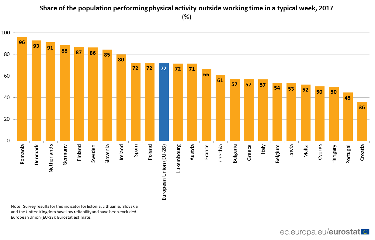 Лише у двох країнах ЄС менше 50% населення були фізично активні - Португалія (45%) і Хорватія (36%). Середній показник по ЄС становить 72%.