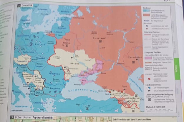 У Німеччині у навчальних закладах почали роздавати атласи, на яких окуповані Росією райони України позначені кольором, який хибно створює враження суперечливої приналежності українських територій.