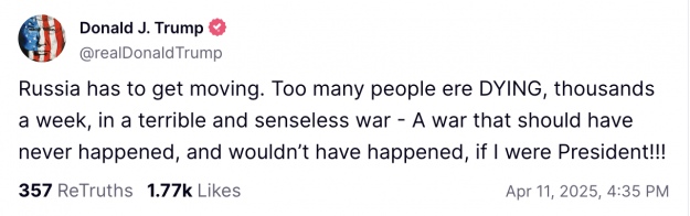 "Занадто багато людей гине, тисячі щотижня, у жахливій і безглуздій війні – війні, яка ніколи не повинна була статися, і не сталася б, якби я був президентом!!!" – додав він.