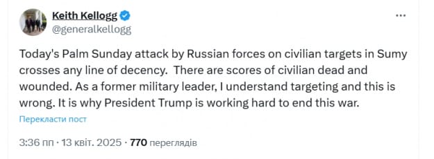 "Сьогоднішня атака російських військ на цивільні цілі в Сумах у Вербну неділю переходить будь-яку межу прийнятного. Є десятки загиблих і поранених цивільних. Як колишній воєначальник, я розумію націлювання, і це неправильно", – заявив Келлог.