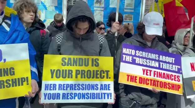 Люди прийшли з плакатами, де звинувачують Альянс у "підгодовуванні диктатури", називають президентку Молдови Маю Санду "проєктом НАТО" і покладають на Альянс відповідальність за "репресії у Молдові". Вони також скандували "НАТО, йдіть додому".