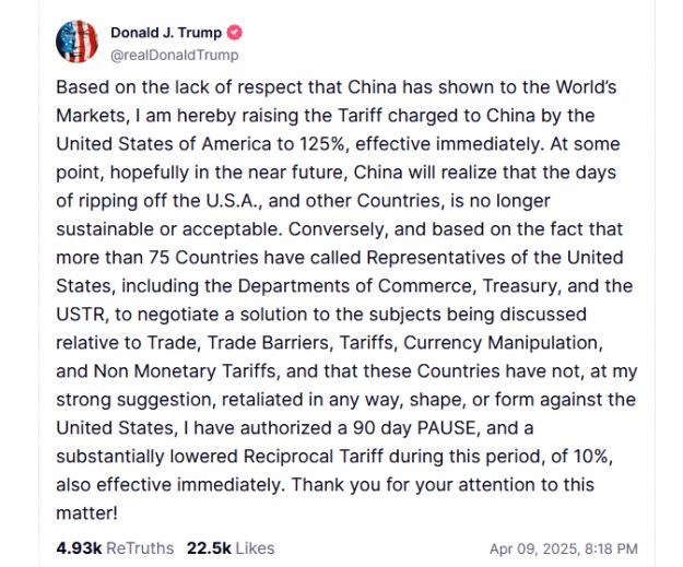 Одночасно Трамп заявив про "негайне" підвищення тарифної ставки щодо Китаю до 125%.