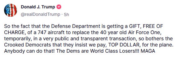 "Тож факт, що Міністерство оборони отримує у подарунок, безкоштовно, літак моделі 747, щоб замінити 40-річний президентський борт, тимчасово, через дуже публічну і прозору транзакцію, так турбує нечесних демократів, що вони наполягають, щоби ми заплатили, у доларах, за цей літак", – написав Трамп, на додачу обізвавши критиків з Демократичної партії "невдахами".